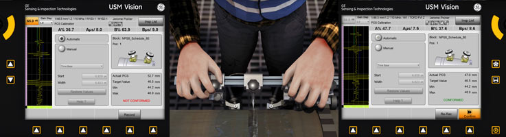 按照向?qū)瓿商筋^和楔塊驗(yàn)證,進(jìn)口超聲波探傷儀,校準(zhǔn)(PCS和TOFD靈敏度、校驗(yàn)、晶片單元和楔塊檢查、記錄相控陣的DAC/TCG曲線),掃查設(shè)置和校準(zhǔn)。