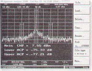 顯示的水平軸(頻率軸)中心頻率為900MHz,掃頻頻寬為1MHz,而每一小格代表l00kHz。頂部水平線表示0dBm,垂直方向每一格代表10dB。信號(hào)已經(jīng)被衰減了10dB,測(cè)量顯示的功率電平已考慮了此衰減。