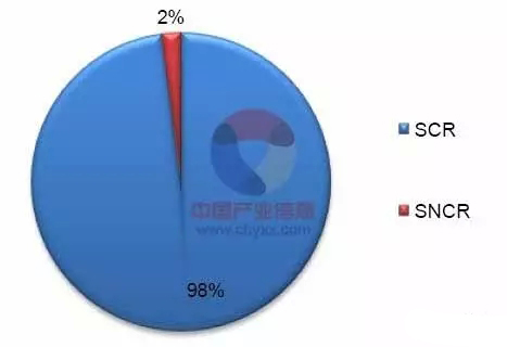 后端煙氣脫硝技術主要有:選擇性催化還原法(SCR)、選擇性非催化還原法(SNCR)、SNCR-SCR混合法。其中SCR脫硝效率為70-90%SNCR脫硝效率僅為40-60%。在已投運火電脫硝機組中SCR市場份額約98%是絕對的主流技術。